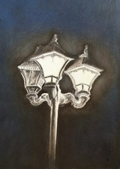 Bei einem Bildformat von 80 x 80 cm liegt die Lampe im Hintergrund im Bereich des Goldenen Schnitts.