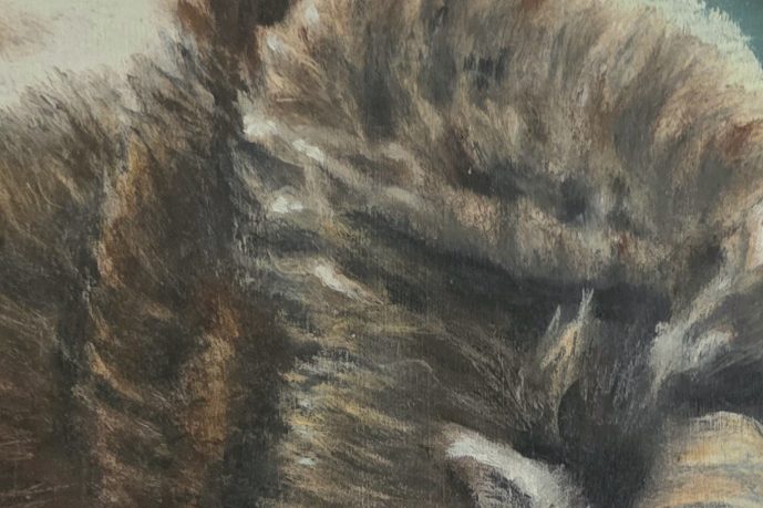 Zottelige oder struppiges Fell bildet oft zusammenhängende Büschel. Lockere, sich überlagernde Pinselstriche in unterschiedliche Richtungen, können den Eindruck von Volumen und Struktur erzeugen. Strähnen dominieren die Oberfläche, dabei deuten untersiedliche Längen eine natürliche Unordnung an.