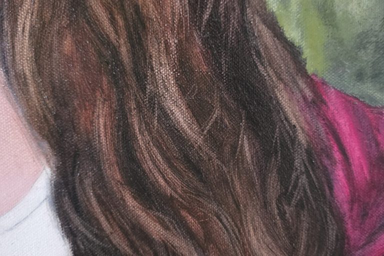 Der Fall oder Schwung von Haaren oder einer Frisur ist vielschichtig. Ein an die Haarfarbe angepasster dunkler Farbton kann die Schattenbereiche einer Frisur darstellen. Damit wird auch die Struktur bzw. die Wuchsrichtung der Haare erfasst. Hellere Bereiche lassen sich zunächst aussparen und hellere Farben darüber gelegt, können den Lichtglanz des Haars suggerieren. Wo direktes Licht auf die Haare fällt sind sie am hellsten.